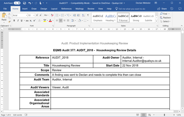 Once the Audit has been Closed the Audit export to either Word or Excel becomes a comprehensive report on all parts of the Audit.