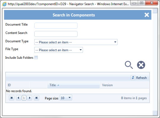 Set the search criteria using the available filters to find the Document(s) you are looking for in the chosen section of the Navigator Tree. If a string is provided for Document Title and Content search only documents that meet both criteria will be displayed. You will be presented with the Search in Components screen similar to this: