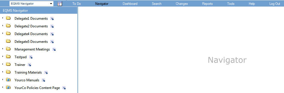 - Select EQMS Navigator | Navigator. You will be presented with a similar screen to this: